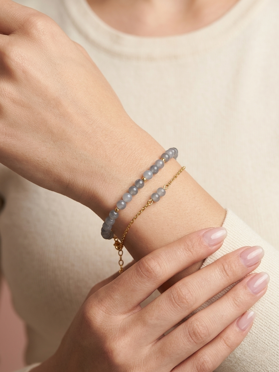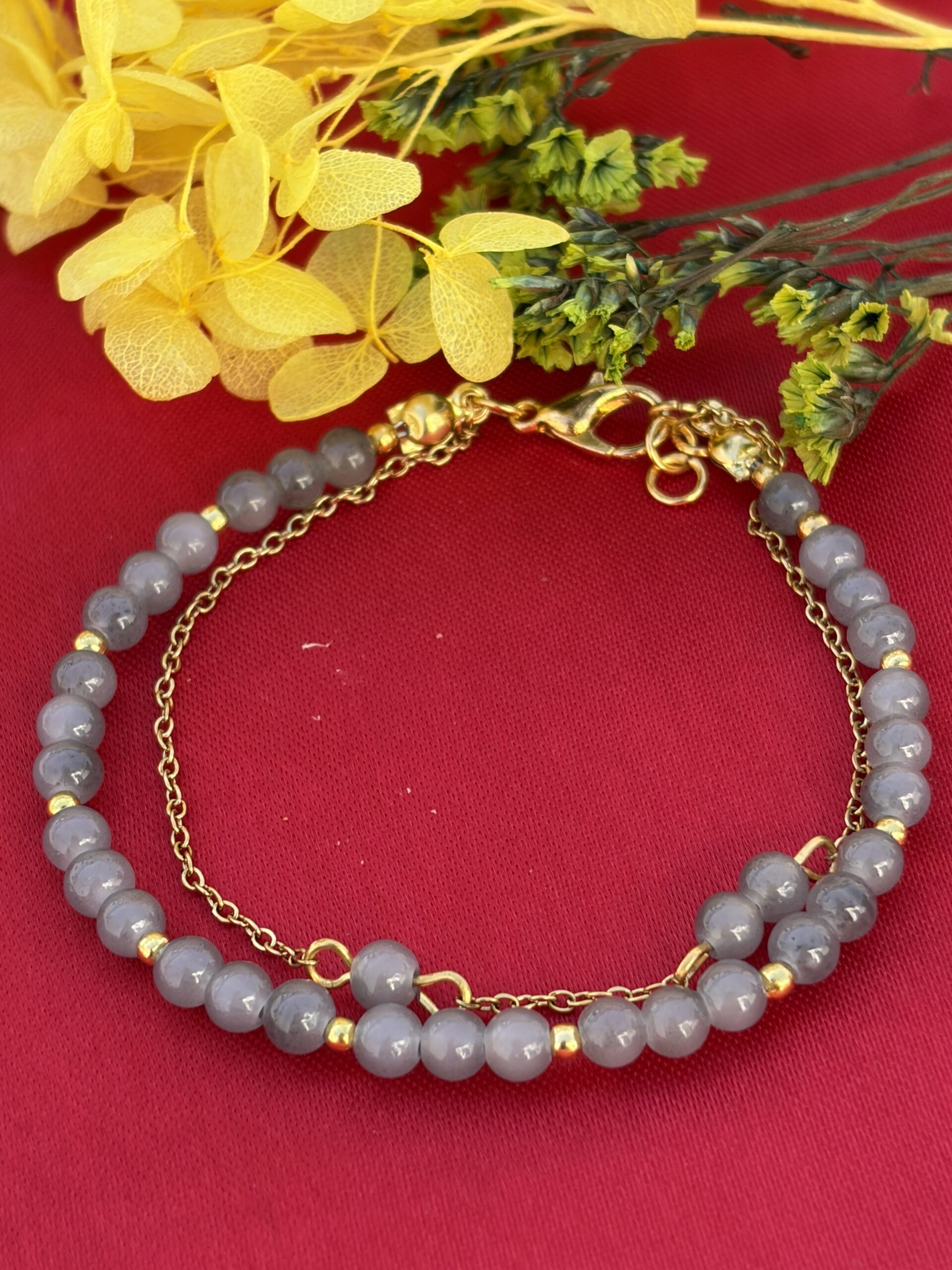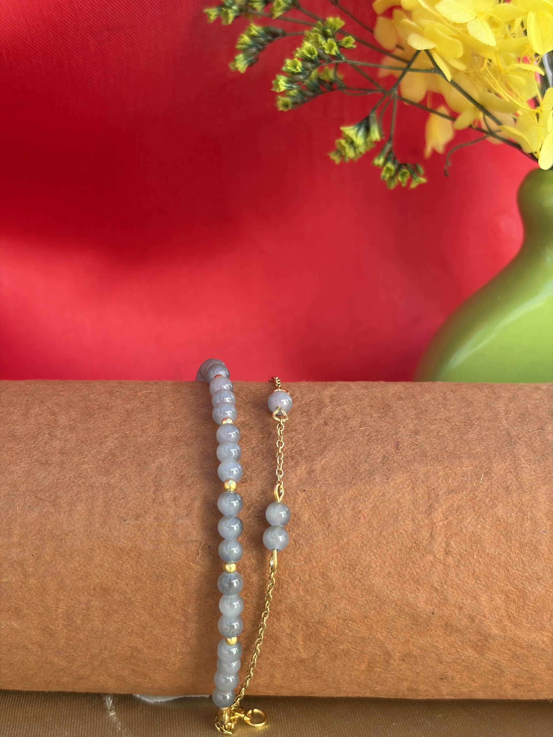 Moon Bead Bracelet by Aazuvi is a minimal handmade bracelet featuring smooth grey beads paired with subtle gold accents. This Minimal Moon Bead Bracelet is designed for those who love clean, elegant, and timeless jewelry.